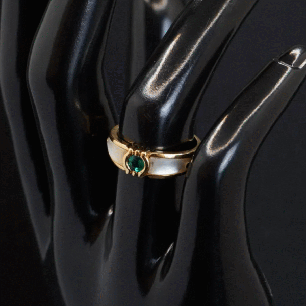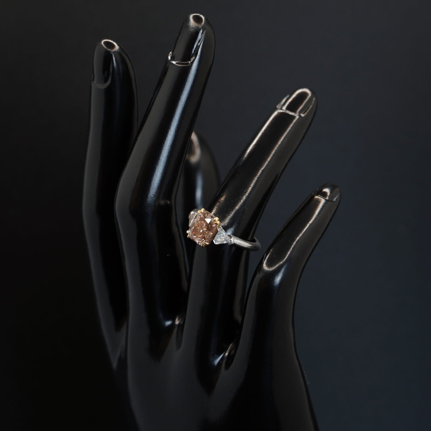 Une bague en Or Blanc 18 carats sertie d’un Diamant Cognac taille Rectangle certifié et de deux Troïdias